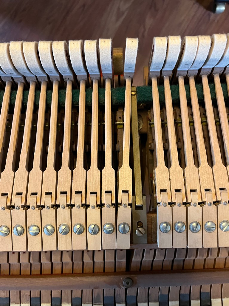 Grand piano action removed for regulation.